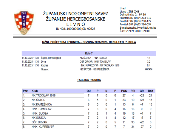 Rezultati 7. kola i najava 8. kola 18.10.2025.