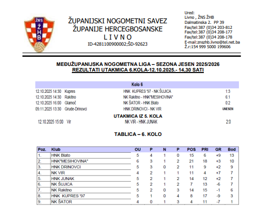 Rezultat 6. kola i najava 7.kola 19.10.2025.